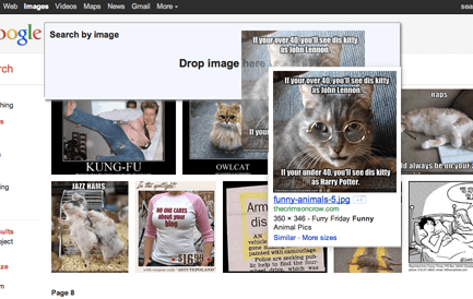 You have probably searched for images on google image search before, but what you probably missed was the drag and drop image search feature. After hovering over an image from the image search results (ex: http://goo.gl/hwiJ0) drag the image over to the search text box. Once the image overlaps the search box, the search box extends allowing you to “drop the image” there.